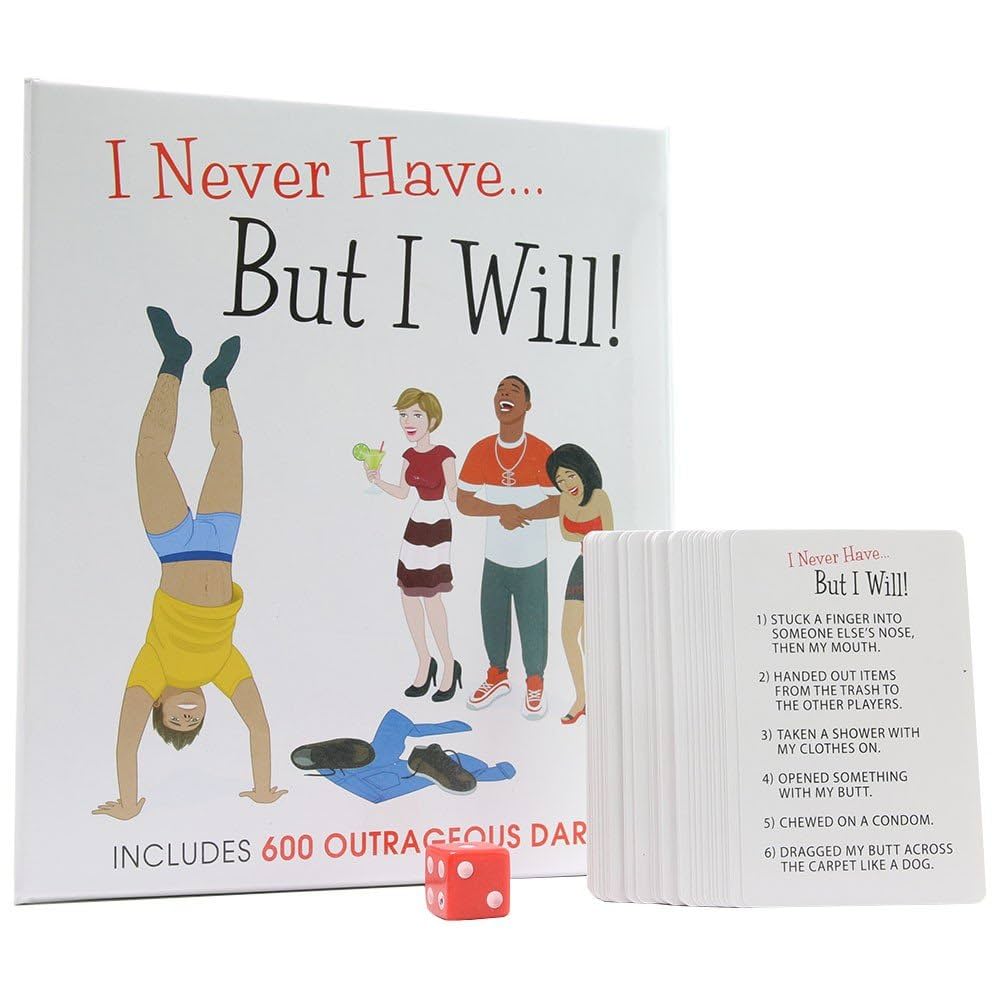 I Never Have But I Will adult game of dares. The crass party game with over 600 dares! After an I Never Have statement is made, players indicate who of them have never done the action. The first of these players who announces, But I Will then acts out the dare and earns the card as a point. Play for points or as a drinking game! You can even offer a prize to the winner, such as candy, wine, a back rub, or a spanking! Includes: a die and 100 dare cards. Adults only please.